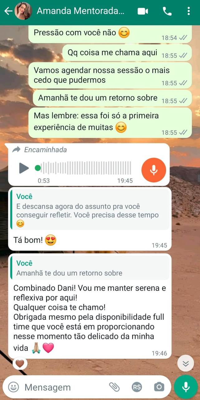 Você não vai perder; vamos só reagendar! É só você me avisar com 24h de antecedência para que eu consiga de encaixar na primeira oportunidade. Eu priorizo cada um dos meus Mentorados; portanto, nosso canal de comunicação será sempre acolhedor, disponível e compreensivo. Conte comigo!