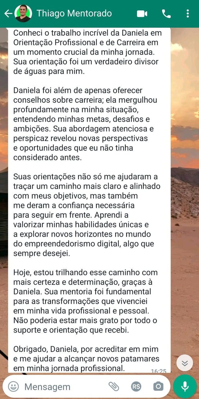 Nesses 13 anos de carreira eu já atendi milhares de pessoas com demandas profissionais e de negócios altamente complexas. Acompanhei universitários, concurseiros, desempregados, pessoas que se sentiam perdidas em transição de carreira ou por falta de perspectivas profissionais. Durante todo esse tempo, eu tive o cuidado de me capacitar, concluindo longos programas de formação, treinamentos executivos, especializações lato sensu, MBA’s e grupos de supervisão para Orientadores Profissionais, mentorias de Negócios com grandes nomes do mercado. Minha bagagem acadêmica e minha experiência profissional são capazes de interpretar suas demandas de Carreira e te auxiliar na compreensão dos seus pontos fortes e fracos; habilidades, interesses e preferências; metas de curto, médio e longo prazo. E é a partir desse trabalho de autodescoberta e guiado pelo seu Projeto de Vida e Plano de Carreira, que você receberá no final da Mentoria, que você poderá fazer e executar as suas melhores escolhas profissionais como Infoprodutor digital. Não existe fórmula mágica, mas existe método, gerenciamento e execução.