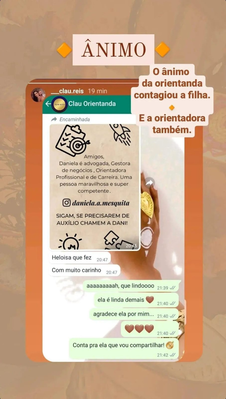 Daniela Mesquita é bacharel em Direito pela UFU e advogada desde 2009. Possui especialização em Direito Empresarial, em Direito Administrativo Público e em Gestão de Produtos, MBA em Gestão de Negócios e MBA em Marketing digital e vendas; atualmente está cursando uma pós-graduação em Direito Digital e Compliance e uma formação chancelada pelo MEC em Registro de Marca. Além das Consultorias especializadas em Gestão Empresarial e Jurídica, atua como Orientadora Profissional desde 2010, ofertando Mentorias de Carreira, de Primeira Escolha Universitária, de Recolocação Profissional, de Orientação Profissional e Escolha de Nicho para recém-formados, de Orientação para Concurso Público, de Re-Orientação Universitária, de Transição de Carreira (profissão, vaga ou cargo) e de Orientação para a Aposentadoria.