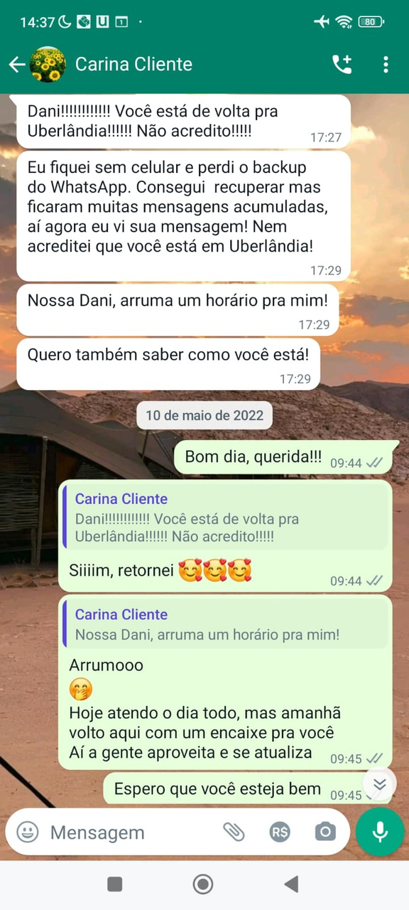 Você não vai perder; vamos só reagendar! É só você me avisar com 24h de antecedência para que eu consiga te encaixar na primeira oportunidade. Eu priorizo cada um dos meus clientes; portanto, nosso canal de comunicação será sempre acolhedor, disponível e compreensivo. Conte comigo!